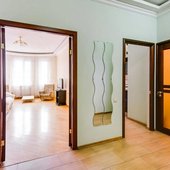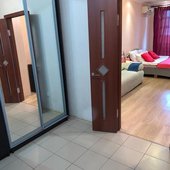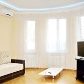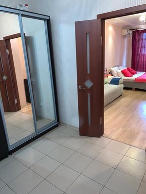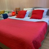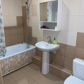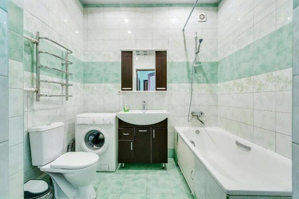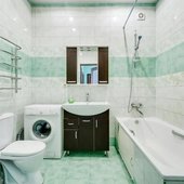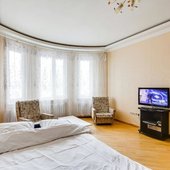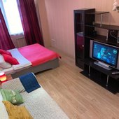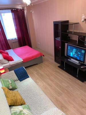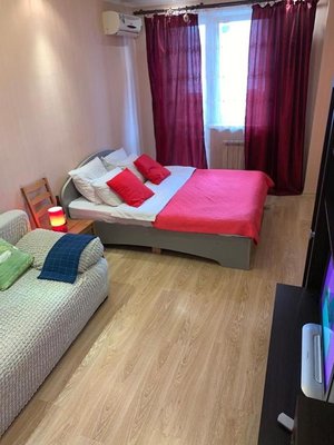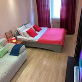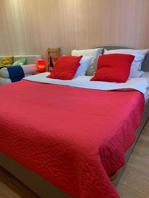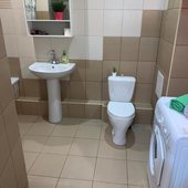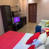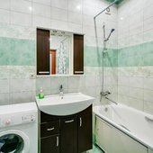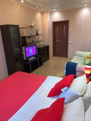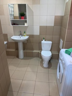 Постояльцам предлагается спальная комната совмещенная с гостиной зоной, в которой установлена мебель и современный телевизор. В санузле установлены: ванная, туалет, раковина и стиральная машина.