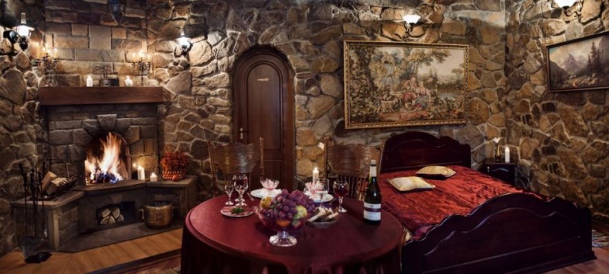 Для заселения гостям предоставляется дома, каждый из которых выполнен в своем неповторимом стиле. Гости могут пожить в замке, выбрать коттедж с камином или беседкой. В каждом из них есть все для комфортного отдыха: спальные места, мягкая мебель, пространство для хранения вещей, современная техника, персональная ванная комната с санузлом.