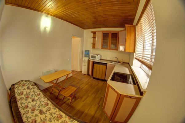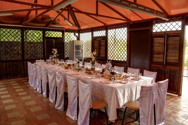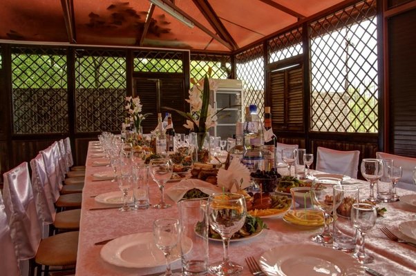 Для приготовления еды предусмотрена кухня, оборудованная бытовой техникой и посудой. На территории есть мангальные зоны и принадлежности для барбекю, что позволяет самостоятельно приготовить любимые блюда на огне. Также, можно покушать в кафе-баре с разнообразными блюдами. Для торжеств есть банкетный зал, организовываются выездные свадьбы.