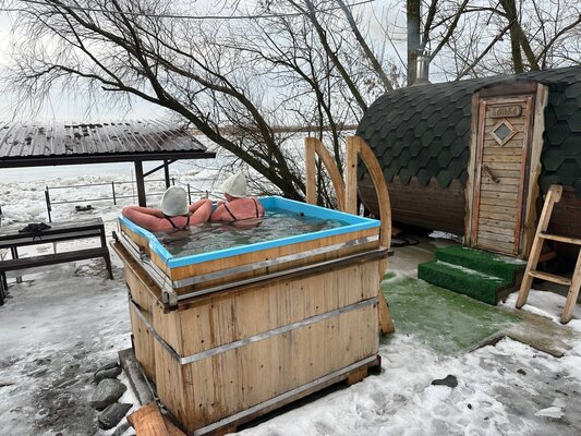 После процедуры вас ждет горячий ароматный чай в беседке у воды в теплое время года или на общей кухне, если морозы заставляют искать тепло. Баня комфортно вмещает до шести человек, делая ее идеальным местом для общения и расслабления в кругу близких
