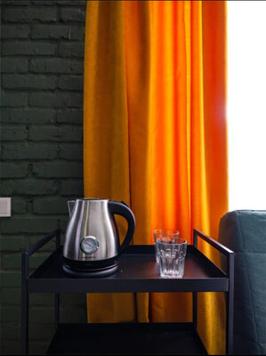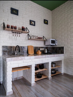 Общая кухня оборудована вместительным холодильником, где каждая полка предназначена для удобства постояльцев, а также газовой плитой, микроволновой печью и духовым шкафом. Все необходимое для готовки и подачи блюд доступно, включая посуду и приборы.