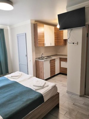 Для самостоятельного приготовления пищи предусмотрена просторная кухня с посудой и бытовой техникой. Рядом с отелем есть супермаркеты, где можно приобрести продукты питания. Также можно посетить кафе, столовые и рестораны, которые находятся поблизости.