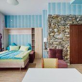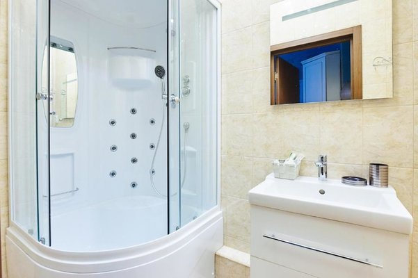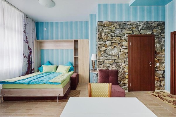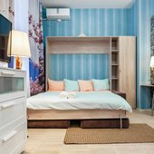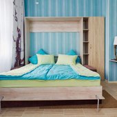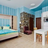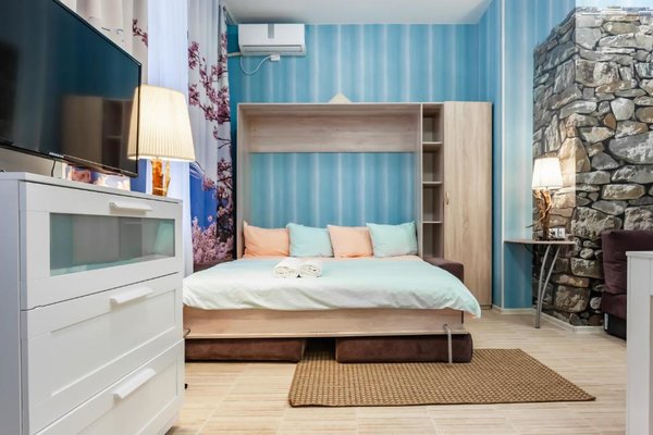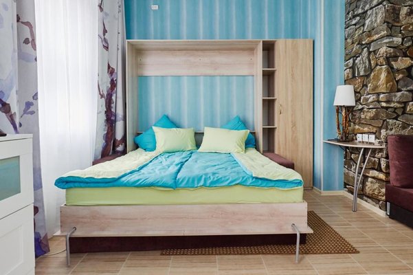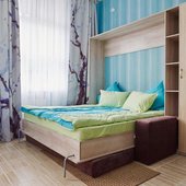 Апартамент имеет два спальных места: двуспальная кровать шириной 180см спальное место и раскладной диван кровать 140 см, с ортопедическим матрасом.
