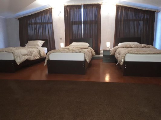 Комнаты просторные, оснащенные всем необходимым для временного проживания с удобным спальным местом, телевизором и сплит-системой. Санузел и ванная комната на этажах общая.