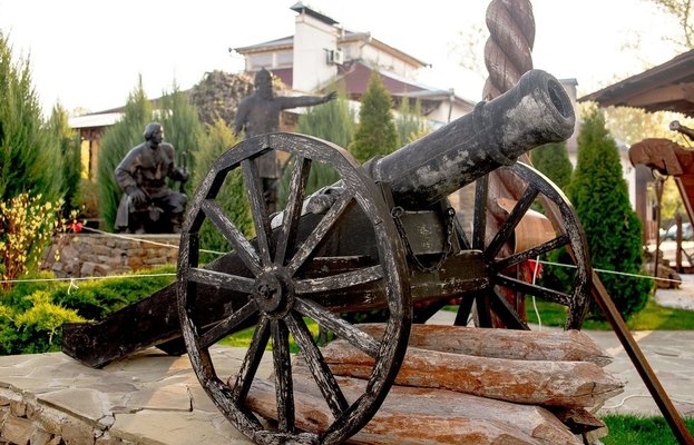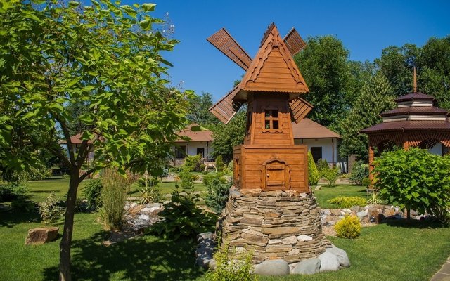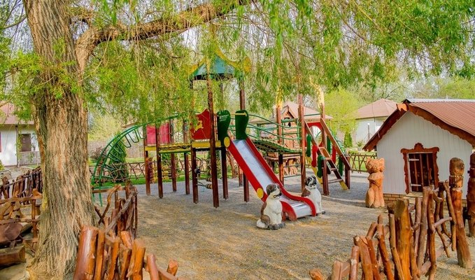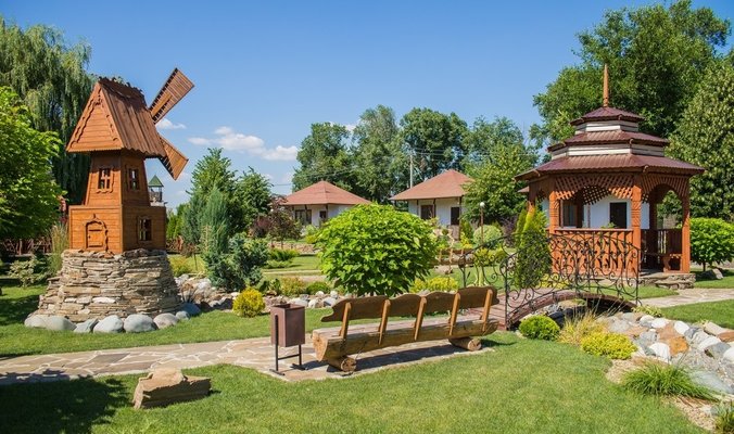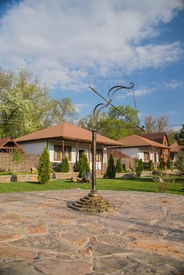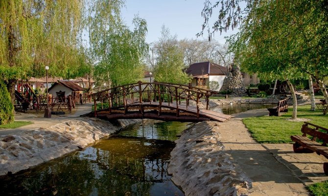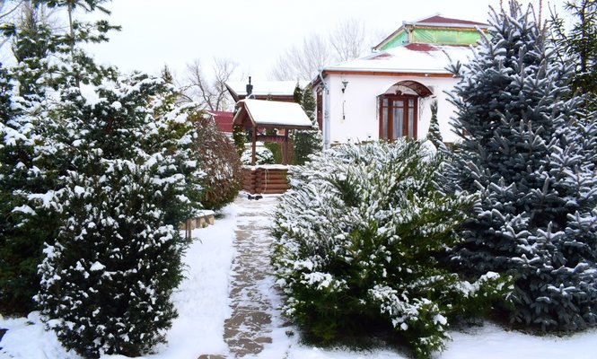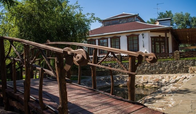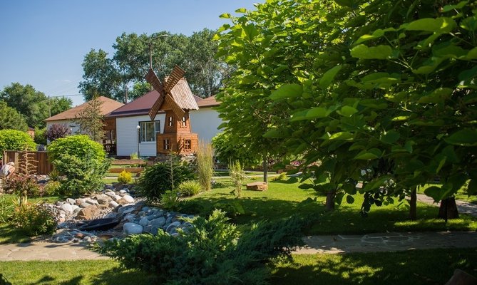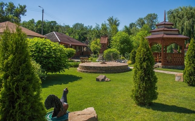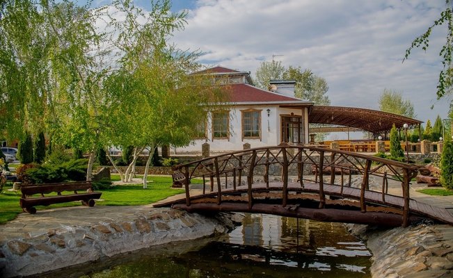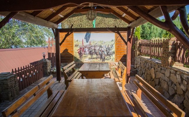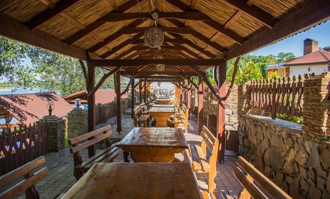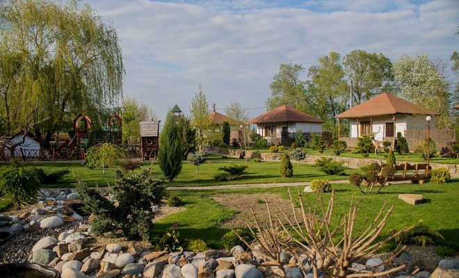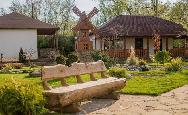 Беленые домики, стилизованные под казачьи курени и отделанные деревом и природным камнем, огорожены плетнем и летом утопают в зелени.