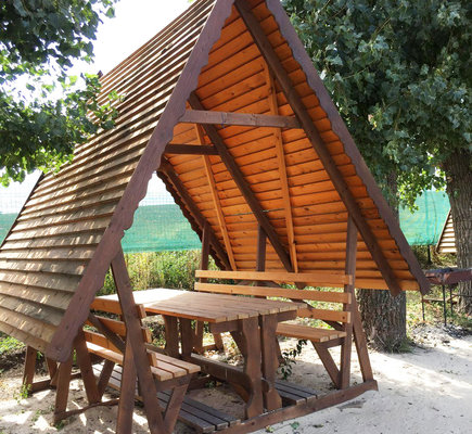 Беседки расположены на песчаном пляже, в тени деревьев, либо непосредственно над прудом с чистой водой. Здесь всегда прохладно и дует легкий ветерок.В каждую беседку проведено электричество, установлены стол и лавочки.Рядом имеются мангалы для шашлыка.