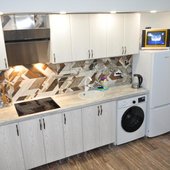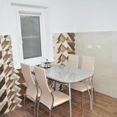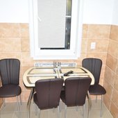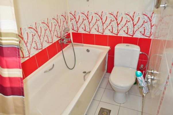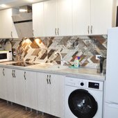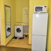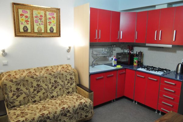 На собственной кухне имеется обеденная зона, посуда и необходимая техника: плита, чайник, холодильник, микроволновая печь.