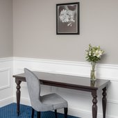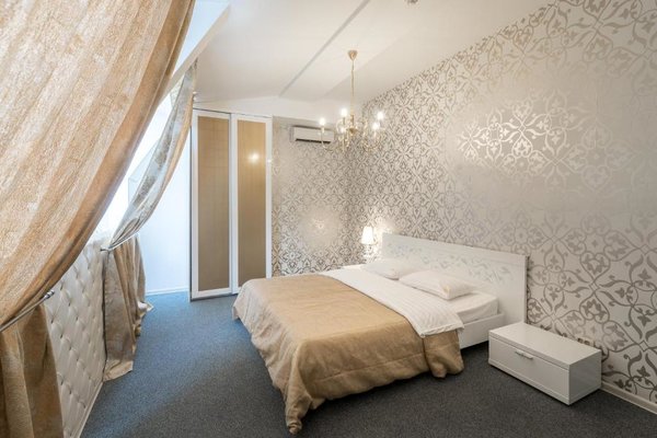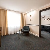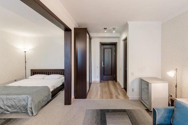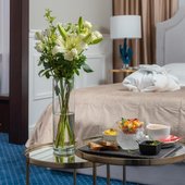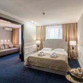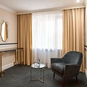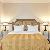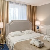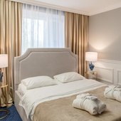 Номера с мягким освещением и деревянным полом оформлены в классическом стиле.