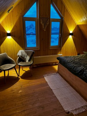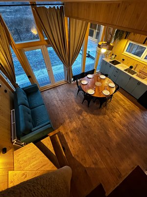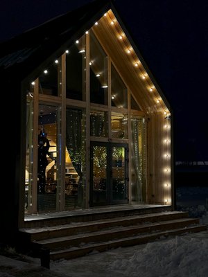 Внутри: чайник, плита, микроволновая печь, набор посуды, холодильник, телевизор, проектор с экраном, фен, душ, полотенца, средства гигиены и большой стол на 8 человек. Две изолированные спальни и двуспальные кровати с диванами. В спальнях и гостиных — панорамное остекление с красивым видом на поле.