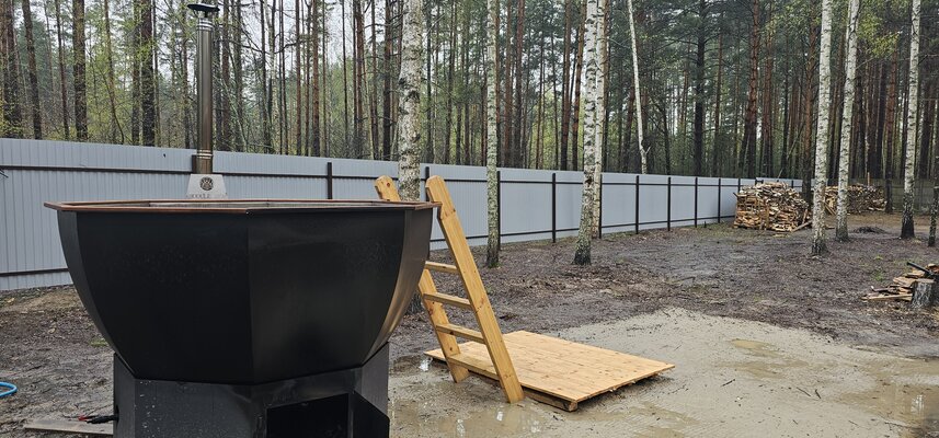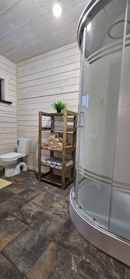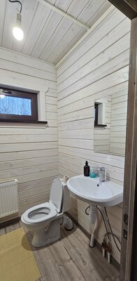 В доме имеются две ванные комнаты с душем и феном. На территории также есть беседка, место для барбекю и банный чан.