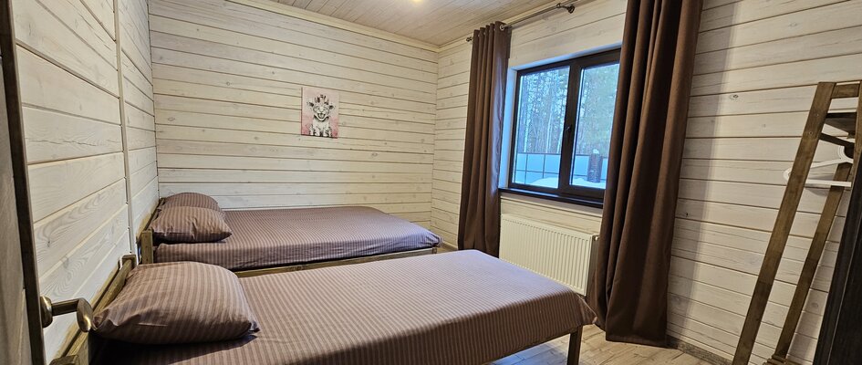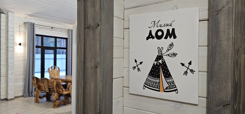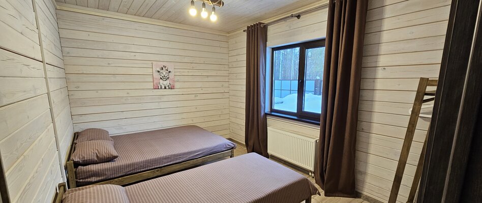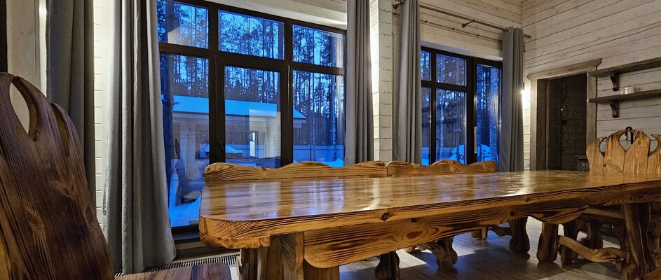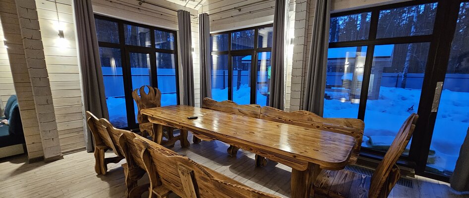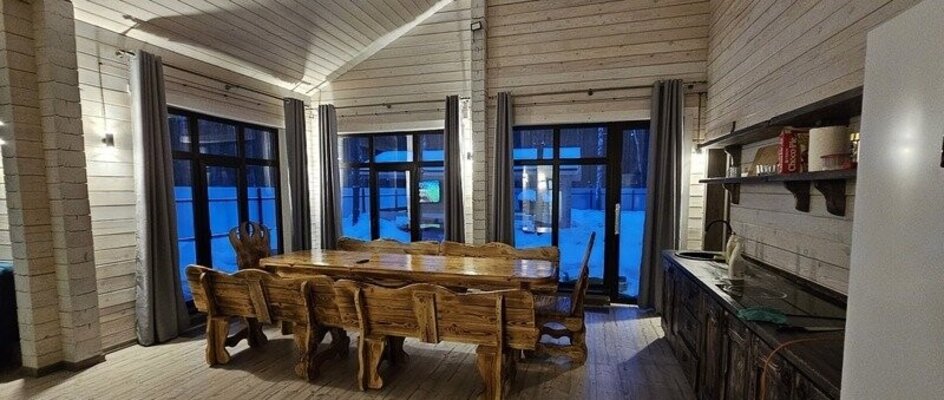 Гостиная оборудована удобным диваном-кроватью. Основное помещение - кухня-гостиная с площадью 47 кв. метров с высокими потолками (5 метров) и панорамными окнами, открывающими прекрасный вид на лес.