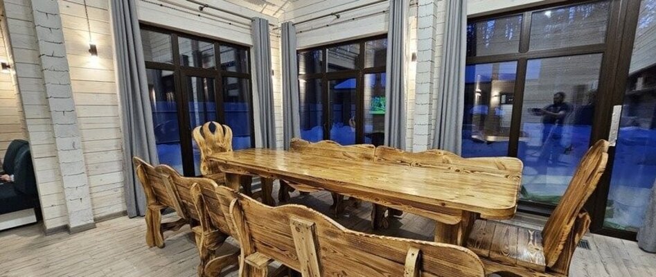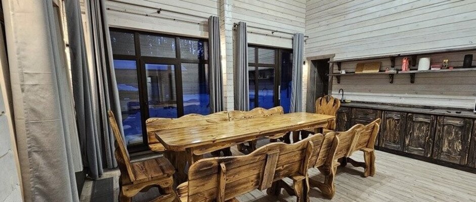 На кухне есть все необходимое оборудование: электрическая плита, чайник, микроволновка и полный набор посуды. Также в доме предоставлен большой ручной стол (длиной 3 метра) из массива дерева.
