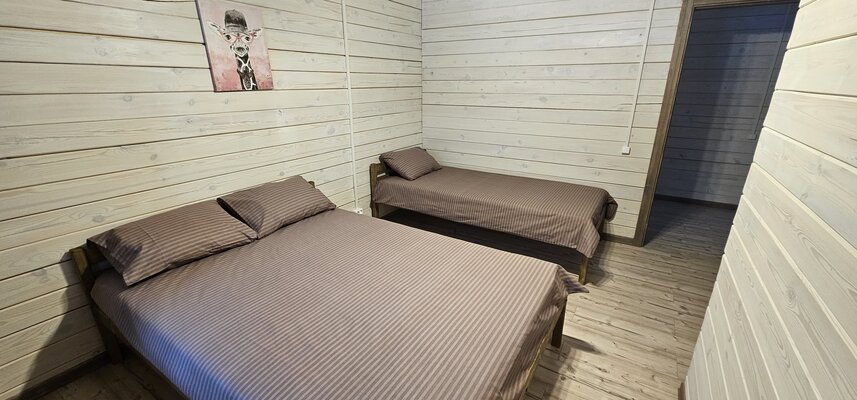 В доме могут разместиться до 12 гостей. Внутри есть 3 спальни с односпальными и двуспальными кроватями, а также предоставляются туалетные принадлежности и постельное белье.