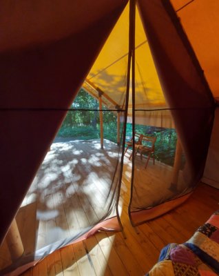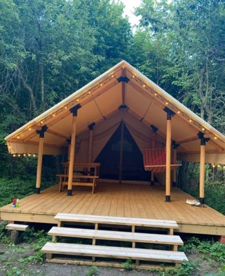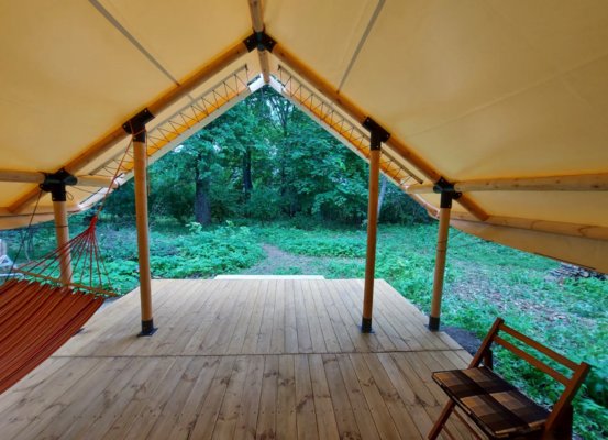На территории глэмпинга установлены уютные сафари-тенты с комфортабельными кроватями, окруженные вековыми дубами, яблонями и липами.