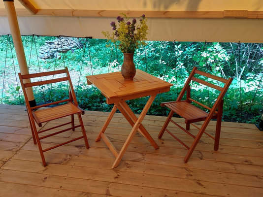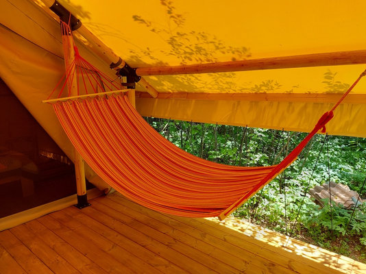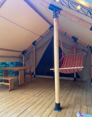 Также на территории имеется костровая зона, качели и песчаный пляж всего в нескольких минутах ходьбы от глэмпинга.