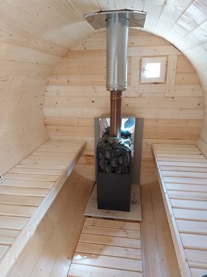 Здесь гости смогут воспользоваться баней-бочкой с удобной зоной отдыха, кухней и санитарным блоком, включающим душ и туалет.