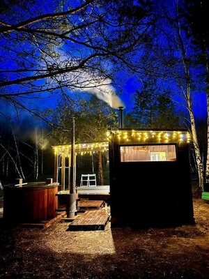 Самое горячее место глэмпинга. Шикарная баня на дровах с панорамными окнами в пол. Тёмный дизайн парилки и купель с джакузи на улице. Травяной чай и веники входят в стоимость.