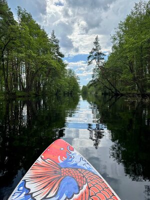 Водный поход пройдет в акватории заповедных рек Ялма и Пра. Маршрут начинается в лесу за деревней Аристово и заканчивается в д. Стружаны. От глэмпинга вас заберёт джип и отвезёт на точку старта. Водный поход на сап-бордах пройдёт за 3 часа, дистанция 12 км по двум речкам. На маршруте вас будут сопровождать краснокнижные птицы, а если повезет, то вдали будет водопой оленей и лосей. После прохождения водного маршрута на финише вас заберёт джип и доставит обратно в глэмпинг «Клюква».