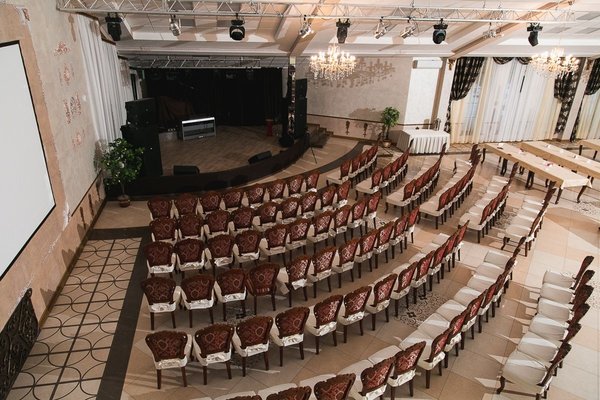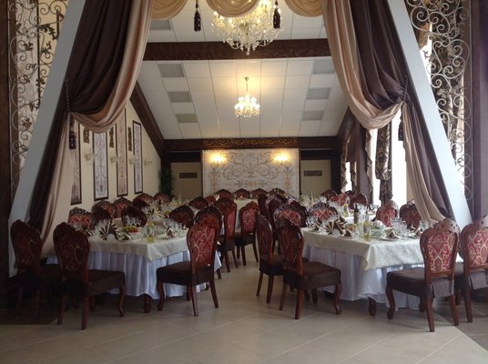 Великолепное место, в котором любое мероприятие превратится в настоящее торжество! Панорамные окна делают зал еще более просторным и позволяют наполнить пространство светом. Высокий разноуровневый потолок, удачное сочетание стекла и дерева в пастельных тонах, подвесные люстры, мозаичные рисунки на стенах, богатый интерьер – хорошее украшение любого праздника!