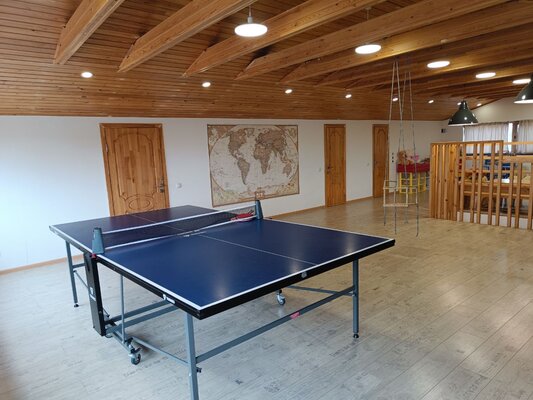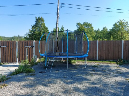 На ухоженной территории вы найдете зону барбекю, батут для детей, а зимой — снежную горку для катания на санках. Для развлечения гостей предусмотрен теннисный стол, обширная детская игровая зона с игрушками, качели, отдельный детский стол на 10 человек и целая стена для рисования.