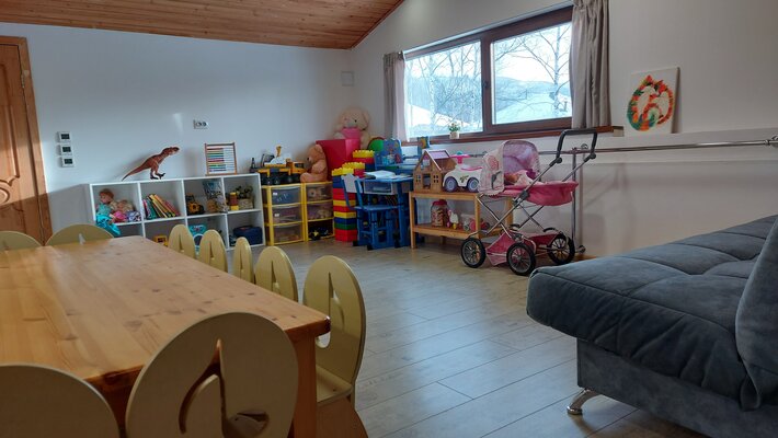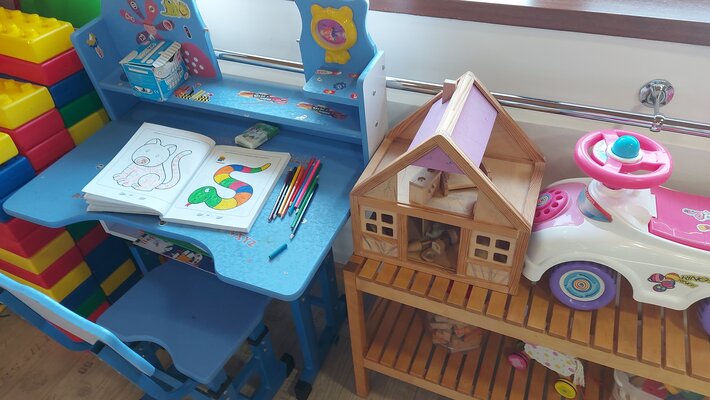 Детская игровая зона с игрушками, отдельно детский стол для 10 ребят, целая стена для рисования.