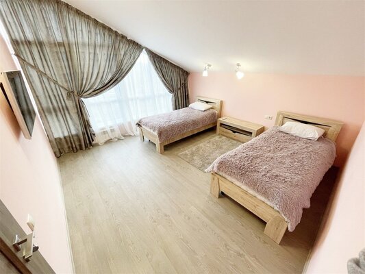 Этот светлый двухэтажный дом, рассчитанный на 14 человек, предлагает 5 комфортабельных комнат с современным ремонтом. К услугам гостей общая кухня-гостиная, где можно собраться всей компанией, и несколько ванных комнат. В каждой комнате есть Wi-Fi, телевизор, гардероб и комплект свежего постельного белья. Полностью оборудованная кухня включает в себя холодильник, микроволновую печь, духовой шкаф, просторную рабочую поверхность и большой обеденный стол. Для маленьких путешественников предоставляются детские кроватки.