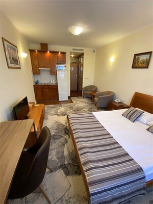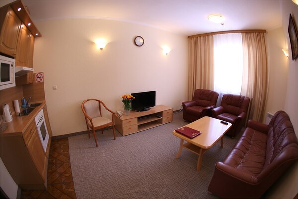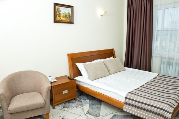 Фасад отеля, выполненный в восточном стиле, придает ему особую изюминку. Гостей ждут комфортабельные и уютные номера, оформленные в теплой цветовой гамме. В каждом номере предусмотрены удобные кровати, качественная мебель и современное оборудование, а в собственной ванной комнате — тапочки, халат и средства личной гигиены. По утрам подаются аппетитные и сытные завтраки. Для желающих самостоятельно готовить оборудована общая кухня. На территории отеля также расположены паб «Мишка» с разнообразным меню и бар, где можно заказать любимые напитки. К услугам постояльцев — спа-салон, стабильный Wi-Fi и бесплатная парковка.