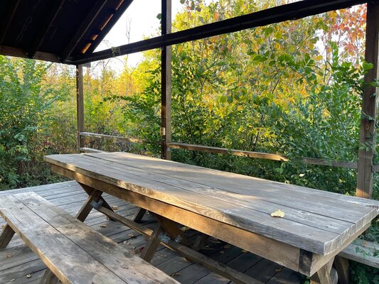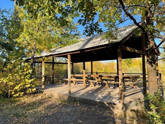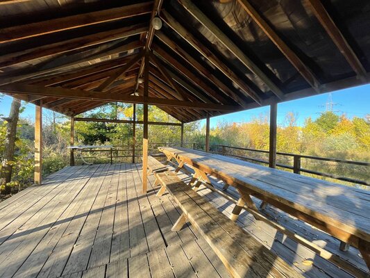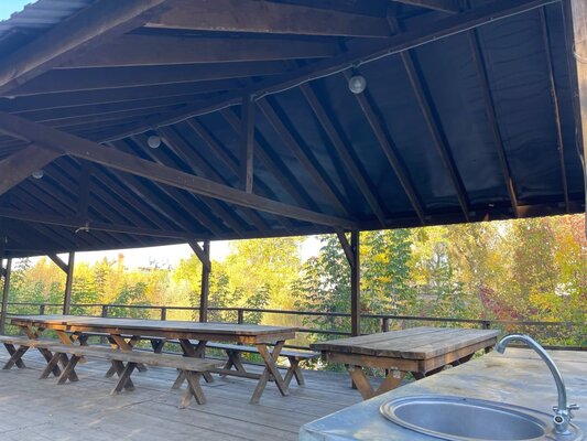 Большая беседка, расположенная в живописном месте у озера, идеально подходит для отдыха на свежем воздухе и наслаждения красивыми видами в компании до десяти человек. Здесь предусмотрена удобная зона для приготовления блюд на мангале, а также оборудована раковина с водоснабжением, что делает пребывание максимально комфортным.