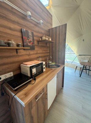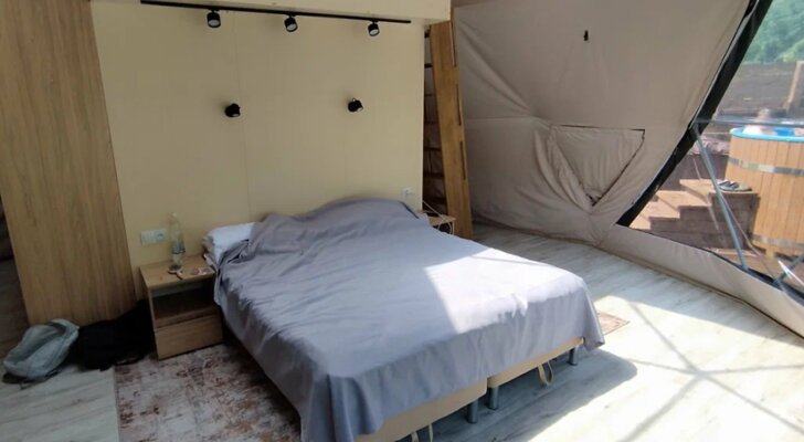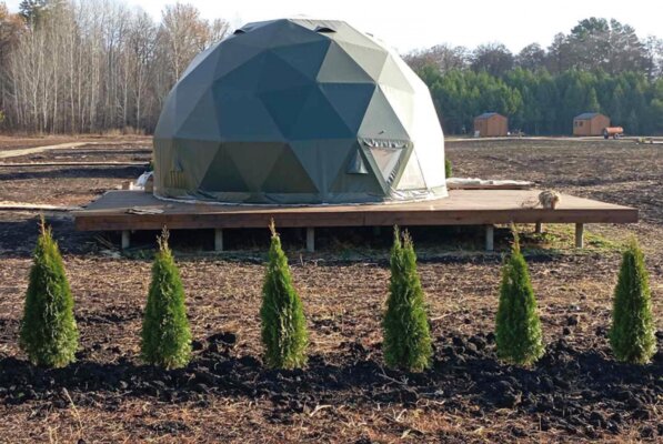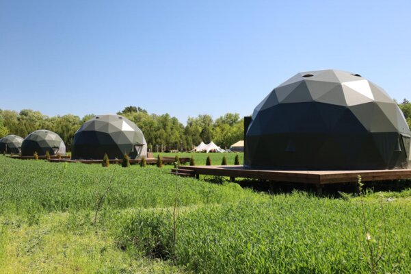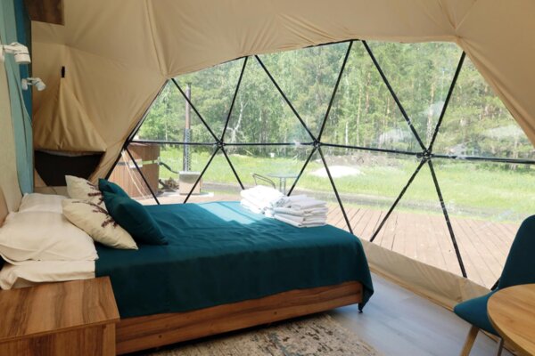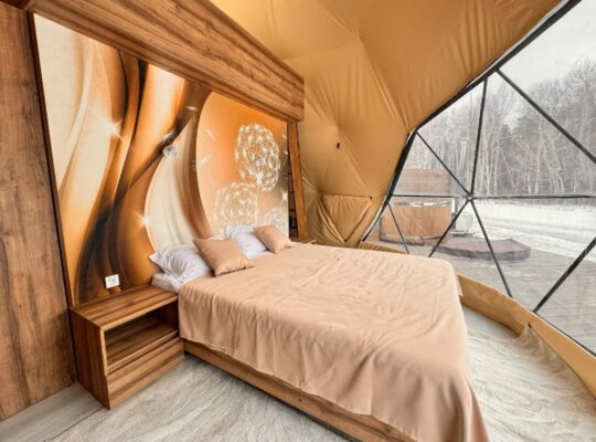 Глэмпинг предлагает 14 комфортабельных домиков: 10 необычных геокуполов и 4 каркасных домика с панорамными окнами и просторными террасами. Одновременно здесь могут разместиться до 60 человек. В каждом домике есть все необходимое для удобства: электричество, отопление, водопровод и канализация.