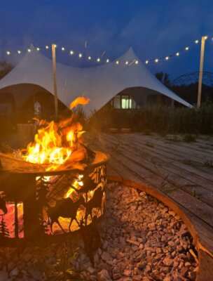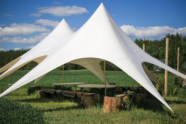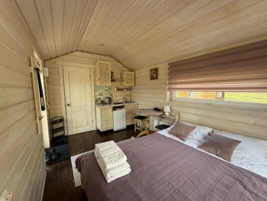 К услугам гостей — зона для барбекю, уютный чайный домик и персональная горячая купель у каждого глэмпа. На территории разбит фруктовый сад, где растут яблони, вишни, сливы, абрикосы, смородина и малина. В сезон сбора урожая гости смогут насладиться свежими, экологически чистыми фруктами и ягодами прямо с дерева.