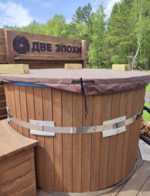 Горячий банный чан под открытым небом. Парение в банном чане на улице комфортно и приятно в любую погоду. В чане горячая вода с добавками (по желанию), внутри удобные сиденья, снаружи — лестница для удобства погружения и выхода из чана.