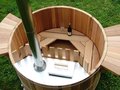 Такая баня представляет собой большую деревянную ёмкость с подогревом дровами .