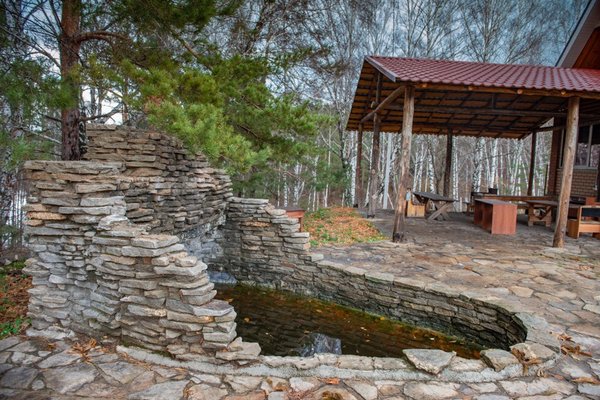 Тёплое здание с баней, сауной с розовой солью, двумя раздевалками с ящичками и двумя санузлами с душем. На улице бассейн подогреваемый круглогодичный 25 м, детский бассейн и чаны с холодной, теплой и горячей (аква-беседка) водой.