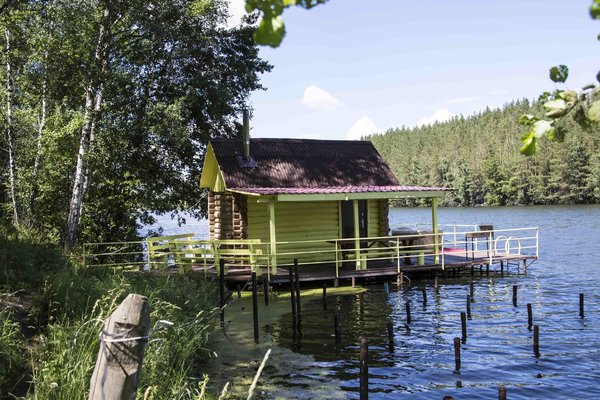 На берегу озера можно прогуляться и искупаться в нем, после чего расслабиться на просторной веранде за чашечкой чая, или за приготовлением ароматного шашлыка на мангале рядом с баней. По завершении банных процедур тут же можно устроить спальные места.