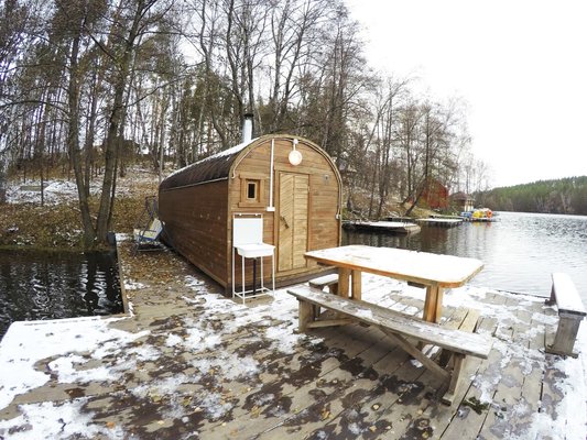 На пляже в 3 метров от озера. Красивая и горячая. 6 метров в длину до 10 человек. Рядом стол с лавками и мангал. Все что нужно для отдыха. С бани и в озеро .