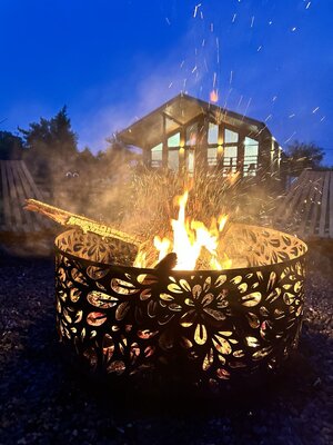 Уютная костровая зона, где можно вечером погреться у костра, закутавшись в плед.