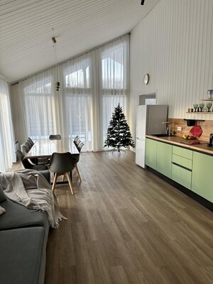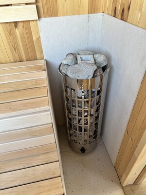 Сауна находится прямо в доме: не нужно одеваться и куда-то идти. Сауна, комната отдыха с небольшим столом и душ все расположено в одной зоне.