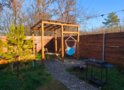 Качели находятся под навесом, рядом с домом.