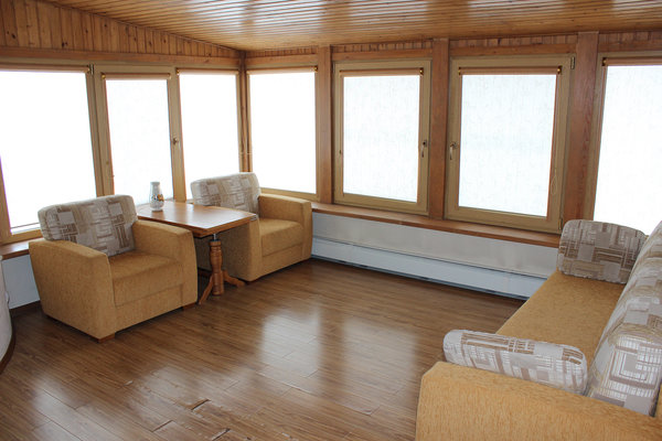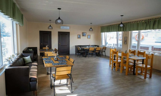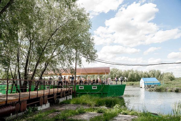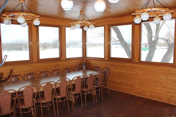 Закрытый кондиционированный зал на дебаркадере с большой зоной остекления и видом на Волгу, просторная веранда, удобная кухонная зона (полный комплект посуды, СВЧ и большой холодильник), ТВ-панель (55*диагональ). Вместимость до 35 человек.