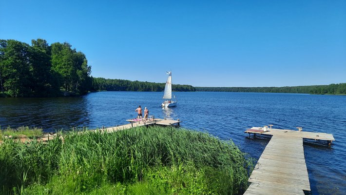 По территории двора и за ее пределами можно совершать прогулки, наслаждаясь красотой пейзажа, чистым воздухом и пением птиц. Особенно живописен вид с берега. Имеется два пирса, с которых удобно ловить рыбу и спускаться в воду при купании. Есть пологий береговой съезд для спуска на воду лодок и катеров.