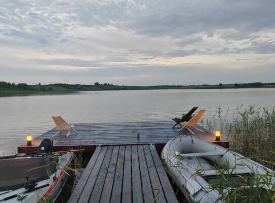 Уютная парная на первой береговой линии. Настоящий сеновал для полного погружения в сельский дзен. Горячая купель фурако на просторной террасе. Патио у самого берега.