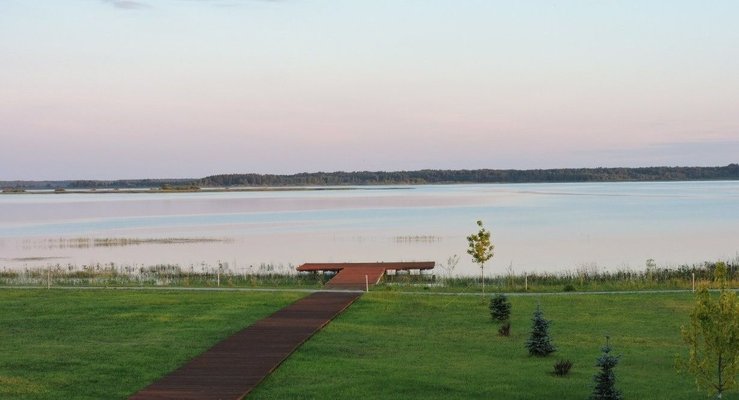 В теплое время года дополнительно открывается летняя терраса с размещением среди молодых берез и видом на воду.