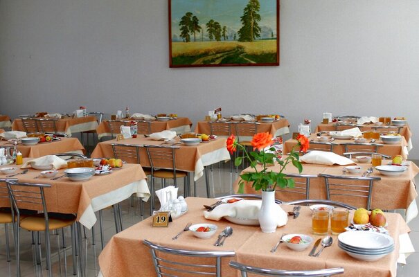 На территории действует столовая, предоставляющая триразовое комплексное питание для гостей. Также доступен беспроводной интернет, парковка, настольные игры, зал лечебной физкультуры, кабинет массажа и собственный источник минеральной воды.