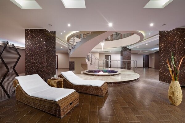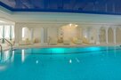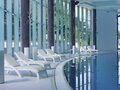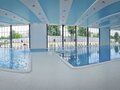 Бассейн комплекса имеет особые зоны термотерапии, джакузи, каскада и эффекта морской волны. По всему его периметру располагается закрытая терраса с зоной для приема солнечных ванн в комфортной обстановке. В мужской и женской раздевалках есть мини-сауны, где можно согреться и расслабиться после купания.