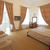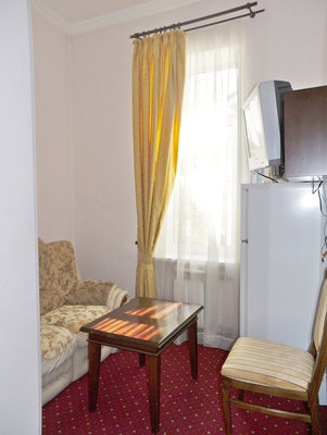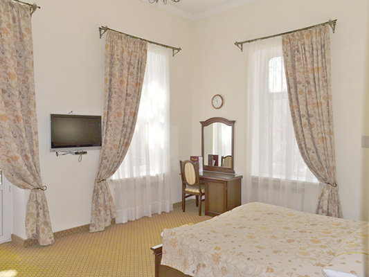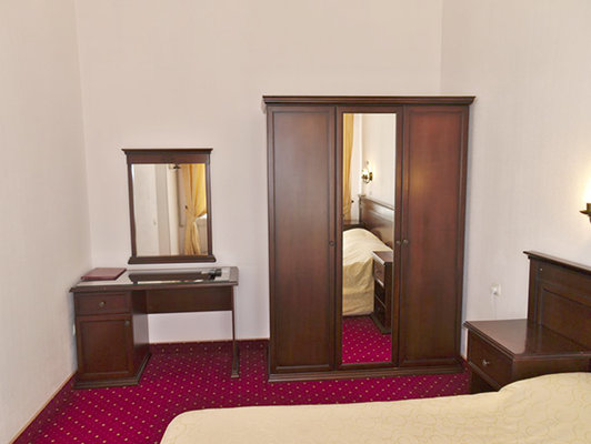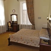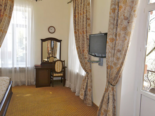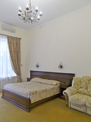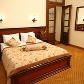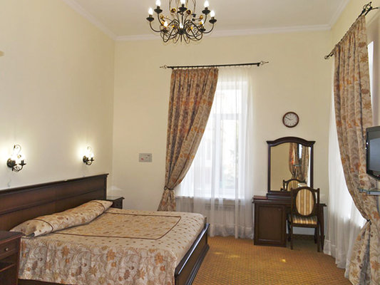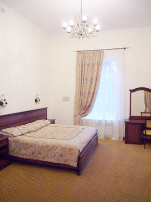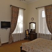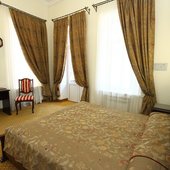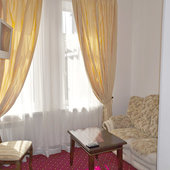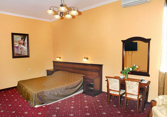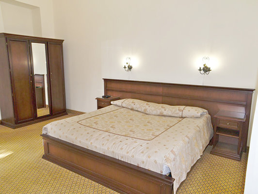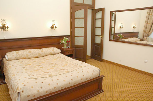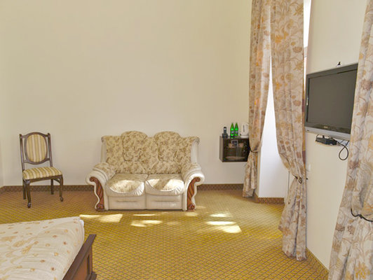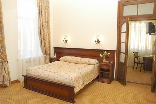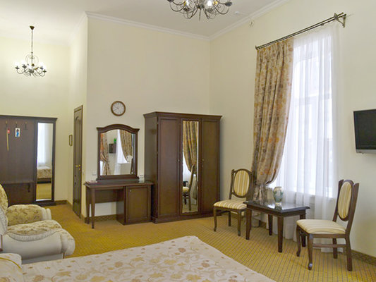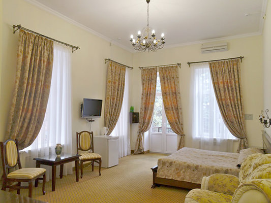 В номерах уютно, спокойно и комфортно: просторные жилые и ванные комнаты, старинные балконы (до 17 кв. м), высокие потолки (до 4,5 м), добротная мебель из натурального дерева, выполненная на заказ, телевизоры в каждой комнате, персональные сейфы, индивидуально регулируемое отопление, кондиционеры, беспроводные телефоны, холодильники, мини-бар, набор посуды и т. д.