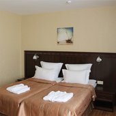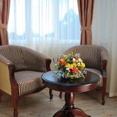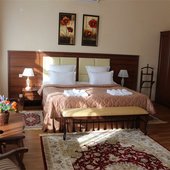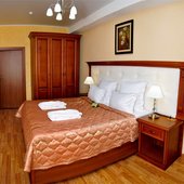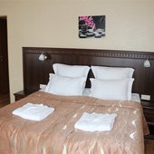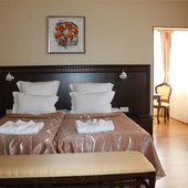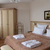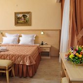 Неплохой отель, позиционирующий себя как санаторий. На оформление не поскупились, дизайн на твердую четверку. Есть собственная скважина минеральной воды, по моим наблюдениям, особой популярностью не пользующаяся. Отдыхающие, да и мы сами, отдают предпочтение Славяновскому бювету в 20 минутах ходьбы. Номера просторные, в меру жесткие матрацы, хорошая мебель, чайник, холодильник, набор посуды, телевизор, сейф, халаты и косметические средства. Полотенца меняли ежедневно, постельное белье раз в три дня. Ежедневно приносили бутилированную воду и пакетированный чай. Проблем с интернетом не было, скорости достаточно для просмотра видео. В стоимость проживания включены завтраки по системе шведский стол. Есть кофемашина с несколькими видами кофе. Особых замечаний по питанию нет. Официанты расторопные, быстро убирают грязную посуду.