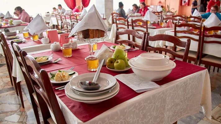 Четырехразовое диетическое питание по предварительному заказ-меню в столовой санатория.