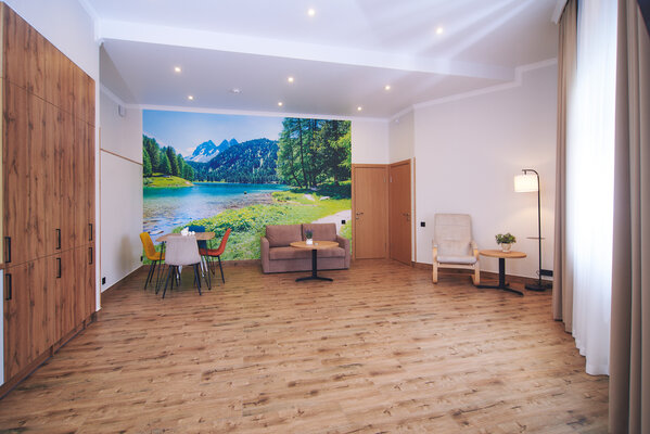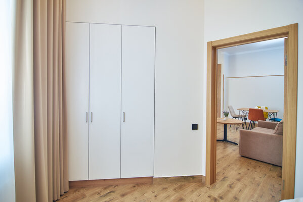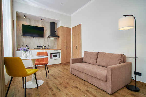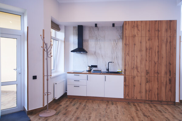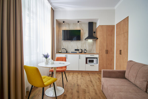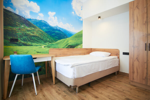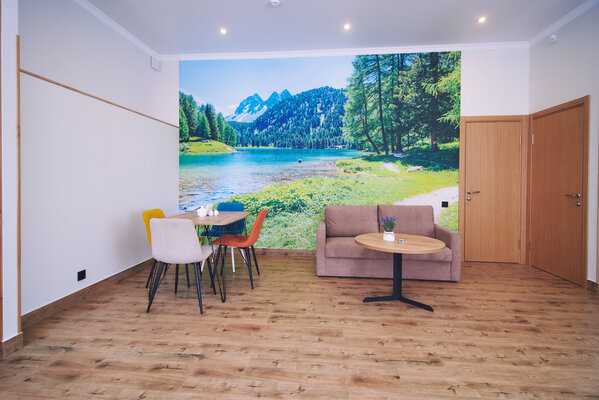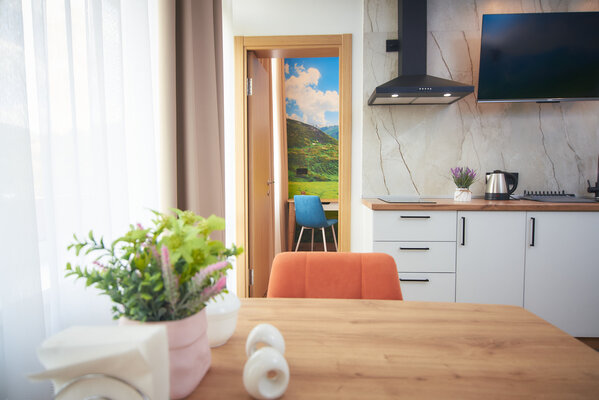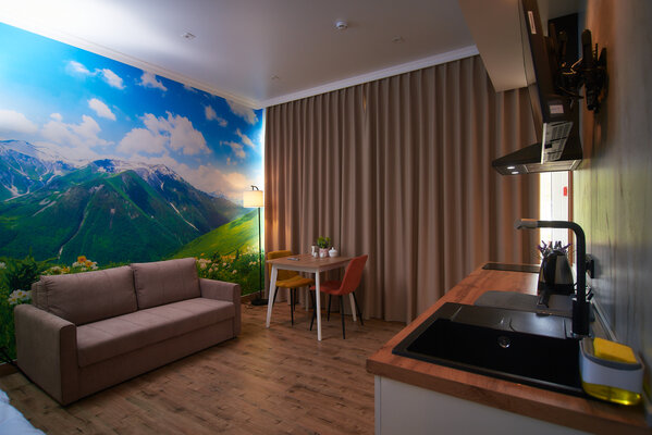 Трехэтажное здание органично вписано в рельефный ландшафт, что непременно оценят любители природы. К услугам гостей комфортабельные апартаменты с кухней, оснащенные всем необходимым, от электроплиты до фена. Современные интерьеры выполнены в светлых тонах с яркими акцентами.