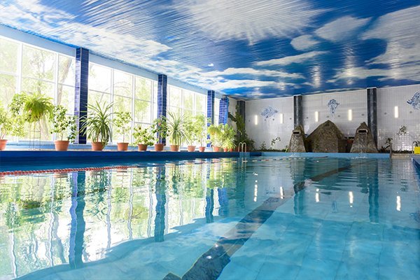 В спортивно-оздоровительном комплексе санатория есть бассейн 25x11.5м с двумя большими каскадами.