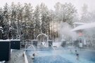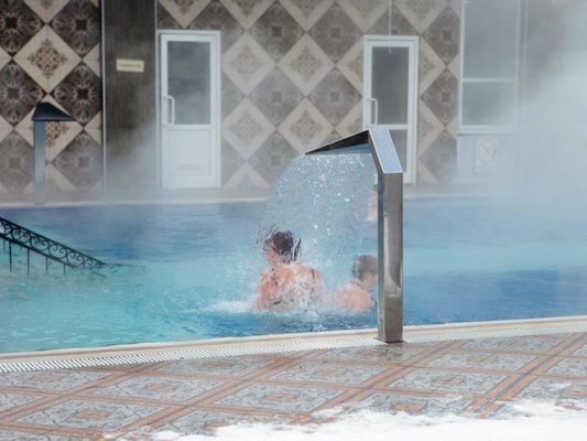 Общая площадь термального открытого бассейна составляет 250 м². Минеральная вода температурой 35-40°С поступает из собственной скважины глубиной 200 м. Бассейн оборудован подсветкой, удобными спусками, фонтанирующим душем, шезлонгами и зонтиками по периметру пляжной зоны. Крытый бассейн площадью 70 м² идеально подходит для купания с детьми, так как имеет небольшую глубину и защищен от ветра и мороза. Встроенные массажеры и лежаки с аэромассажем понравятся и детям, и их родителям.